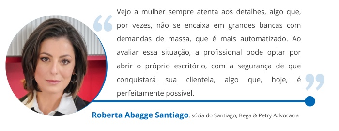 "Atualmente, esse processo de transição entre escritórios é facilitado pela maior valorização da diversidade nas empresas. O cenário propicia que as mulheres se destaquem ao sair de grandes bancas para abrir o próprio negócio e, a partir daí, consolidar a admiração de seus clientes", afirma Roberta Abagge Santiago, sócia do Santiago, Bega & Petry Advocacia (SBP Advocacia).