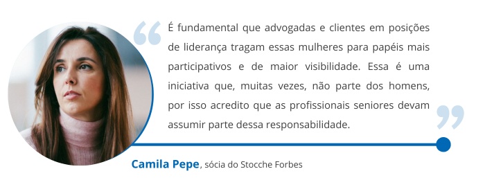 Camila Pepe, sócia do Stocche Forbes e eleita Mais Admirada no setor de Energia Elétrica pelo ANÁLISE ADVOCACIA MULHER 2026, acredita que a reversão desse cenário depende de uma rede de apoio entre gerações, na qual profissionais seniores auxiliem o desenvolvimento de advogadas em início de carreira.