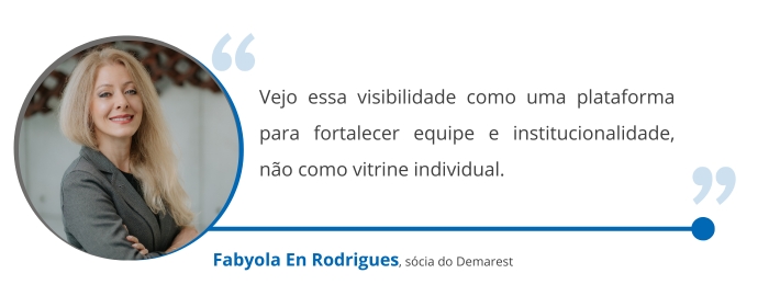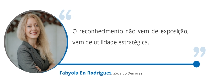 Na mesma linha que Rosenberg, Fabyola En Rodrigues interpreta o resultado com foco em relações e responsabilidade. "Admiração, no mercado, nasce da combinação entre competência técnica e confiabilidade relacional. Executivos valorizam quem entende o momento do negócio, quem é confiável sob pressão", avalia a sócia do Demarest. Além disso, ela aponta que figurar no ranking amplia deveres internos: