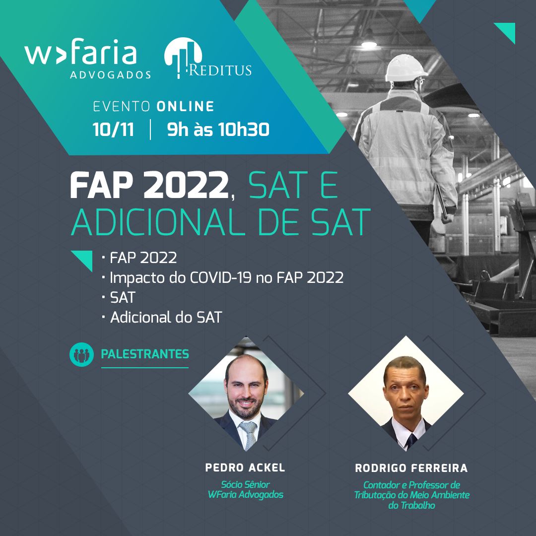 O escritório WFaria Advogados e a Reditus promovem um webinar para expor sobre o FAP 2022, SAT e adicional de SAT.
