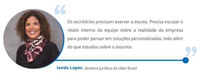 Já Ianda Lopes, diretora jurídica da Uber Brasil, reforça que a personalização da solução jurídica começa com a humildade de ouvir ativamente o cliente. Para ela, o advogado precisa mergulhar no contexto e na cultura da empresa para entregar um trabalho realmente eficaz.