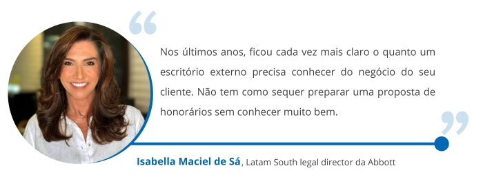 Isabella Maciel de Sá, Latam South legal director da Abbott, ressalta que esse destaque para escritórios com conhecimento mais aprofundado sobre o negócio da empresa é recente. a executiva aponta que questões consideradas simples, como propostas de honorários, se tornam mais complexas na ausência do conhecimento do negócio. Essa tendência de mercado reforça que a profundidade e a parceria deixaram de ser um diferencial e se tornaram um requisito para a advocacia corporativa.