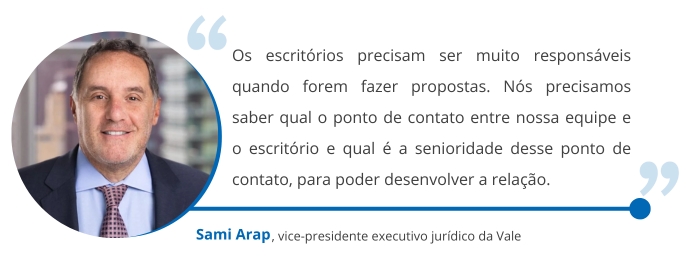 No campo da aplicação prática, a proposta de honorários funciona como um termômetro da capacidade do escritório de atuar como parceiro. Sami Arap, vice-presidente executivo jurídico da Vale, explicou o que espera nesse momento."A proposta completa tem preço com honorários justos, pois os profissionais precisam ser bem remunerados, mas o mais importante é: qual é a equação financeira? Que equipe vai nos atender e como ela agrega valor?".
