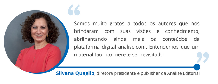 Com coordenação de Aline Fraga, editora de conteúdo de analise.com, e curadoria de Silvana Quaglio, Alexandre Secco e Ligia Donatelli, a coletânea traz os textos que atraíram mais leitura, que apresentaram os temas mais atuais e relevantes, e as abordagens mais singulares.
