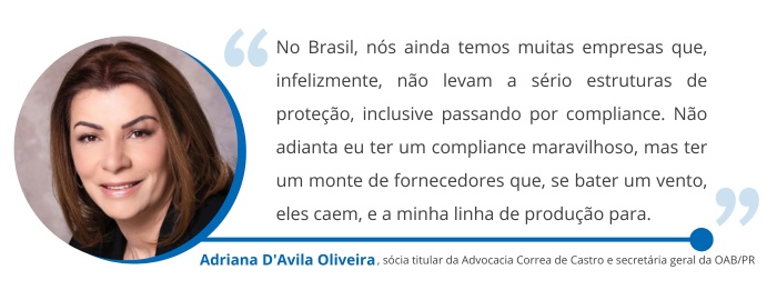 Adriana D'Avila Oliveira, sócia titular da Advocacia Correa de Castro e secretária geral da OAB/PR diz que o compliance também tem um papel crucial no PCN. Para ela, é preciso mapear fornecedores e verificar se eles possuem capacidade econômica e estrutura para manter a linha de produção operando, mesmo após calamidades climáticas.