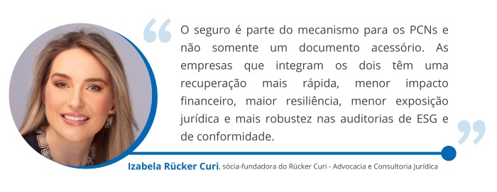 Para Izabela Rücker Curi, sócia-fundadora do Rücker Curi - Advocacia e Consultoria Jurídica, por mais que as empresas tenham um PCN, se ele não estiver alinhado ao perfil de risco climático, a empresa fica exposta. Dessa forma, com essa construção conjunta, Izabela afirma que o seguro passa a desempenhar três papéis fundamentais dentro do PCN: