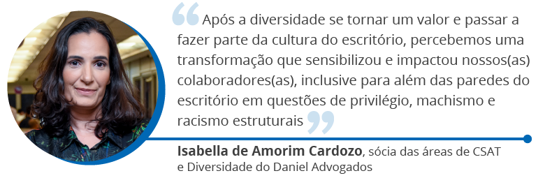 Isabella conta que, desde então, passaram a frequentar fóruns de diversidade voltados à questões de gênero e perceberam que, embora ainda houvesse muito trabalho a ser feito, já haviam alcançado muitas mudanças orgânicas no tema, como a equidade de gênero no quadro de colaboradores(as), sócios(as) e líderes. Além disso, um alerta sobre as outras inteseccionalidades da diversidade foi aceso e o programa de D&I do escritório, o Daniel Plural, passou a ser construído.