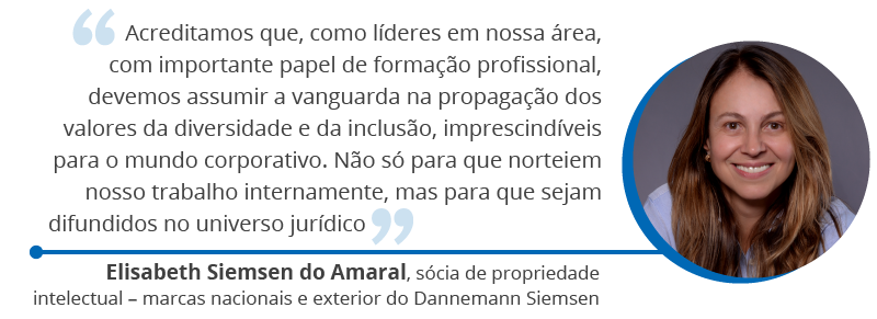 Já no Dannemann Siemsen Advogados, Elisabeth conta que foram adotadas várias estratégias: ambientação dos consultores especializados em D&I com os diversos setores do escritório, reuniões com o departamento de Recursos Humanos, a fim de mapear a organização da banca, reuniões com a alta liderança e a equipe responsável pela implementação do programa para estabelecer as suas diretrizes e bases, além da elaboração de um questionário personalizado para a realização do diagnóstico de diversidade. A agente de PI também destaca a busca por parcerias com instituições para projetos de inclusão, como o Projeto Incluir Direito, que atua na formação, desenvolvimento e inclusão de jovens negros de baixa renda, estudantes de Direito, no mercado de trabalho. No caso do projeto DS Elas, Elisabeth adiciona que um programa de mentoria interna está sendo desenvolvido como forma de inspirar uma cultura inclusiva, que estimule o desenvolvimento e aumento da representatividade feminina na liderança, valorizando os talentos femininos do escritório.