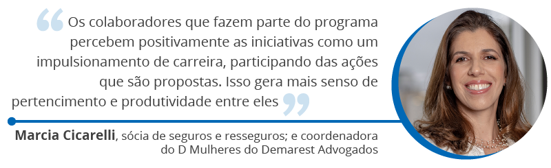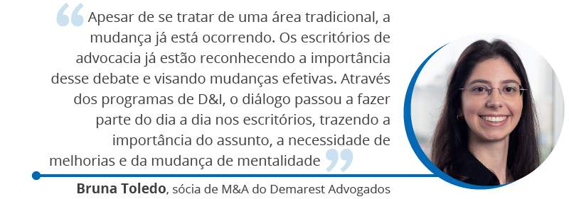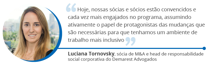 Há também os casos de firmas advocatícias que precisaram ir além da ideia de ter apenas um bom ambiente de trabalho, instaurando medidas práticas para difundir a diversidade internamente, como foi o caso do Demarest Advogados. Luciana Tornovsky, sócia de M&A e head de Responsabilidade Social Corporativa e Marcia Cicarelli, sócia de Seguros e Resseguros e atual coordenadora do comitê D Mulheres, pontuam que o escritório possuía poucos negros, tinha mais homens do que mulheres na liderança e que os debates sobre questões ligadas à orientação sexual e identidade de gênero eram escassos. Para mudar este cenário e promover uma cultura organizacional mais inclusiva, foram criados comitês específicos para cada pilar da diversidade, sendo o primeiro deles o D Mulheres, que trata sobre a equidade de gênero. Posteriormente, a firma criou o D Raízes (étnico-racial) e o D Mais (LGBTI+), que integram o D Impacto, programa de D&I da banca.
