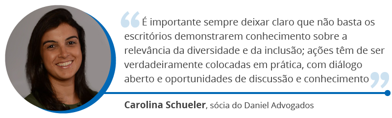 Carolina Schueler, sócia da área de marcas, afirma que as ações em prol da equidade de gênero tornam o ambiente do escritório muito mais agradável para uma mulher trabalhar do que o de um que não se preocupa com essa questão. Ela destaca que, além dos salários igualitários, a banca possui uma atenção especial para as colaboradoras que planejam ser mães: licença-maternidade de 180 dias, dez meses de estabilidade após o retorno e salas de amamentação internas. Carolina também enfatiza que ambientes profissionais não inclusivos tendem a ser menos abertos e receptivos, tornando-se verdadeiros limitadores de experiências dos funcionários e destacando ainda mais as organizações engajadas em questões diversas, que fomentam empatia e transparência entre líderes e liderados.
