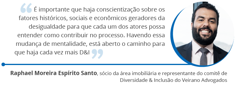 Outra banca que também está envolvida com o tema é o Veirano Advogados, que começou a refletir sobre o assunto após perceber uma necessidade vinda de fora das paredes do escritório. Segundo Raphael Moreira Espírito Santo, sócio da área imobiliária da banca, D&I surgiu em resposta a uma crescente percepção do escritório sobre o aumento da relevância do tema em empresas - sobretudo em alguns de seus clientes -, parceiros e associações das quais fazem parte, requerendo iniciativas e medidas concretas que gerassem maior diversidade no ambiente profissional.