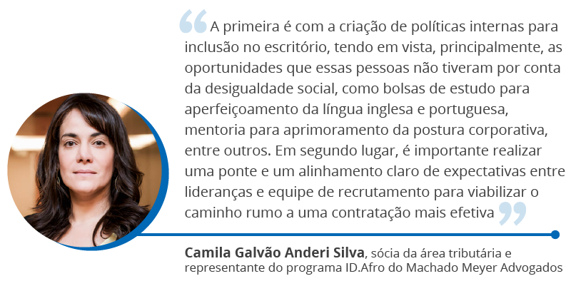 Camila também enumera duas ações que os escritórios podem adotar para contribuir com o desenvolvimento de carreira dos estagiários e recém-formados negros: