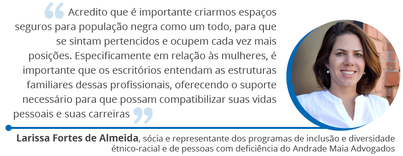 No escritório Andrade Maia Advogados a pauta da diversidade sempre esteve presente, que desde sua criação sempre foi composto por muitas mulheres e pessoas LGBTI+, afirma a sócia da área trabalhista, Larissa Fortes de Almeida. Porém, perceberam que em seus processos seletivos contavam com poucos candidatos negros e PCDs. A partir daí, através de iniciativas de inclusão, procuraram entender a razão para isso e buscaram novos meios para alcançar esses profissionais.