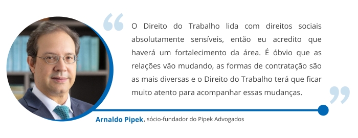 No setor Trabalhista, Arnaldo Pipek, sócio-fundador do escritório Pipek Advogados, ambos Mais Admirados há 20 anos, acredita que os escritórios precisam estar preparados para acompanhar as grandes mudanças que estão surgindo no Direito do Trabalho, pois o corpo social vive em constante metamorfose.