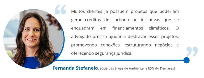 Nesse contexto, a advocacia será demandada a traduzir a complexidade técnica e regulatória em estratégias de negócio. Isso inclui a assessoria na estruturação de projetos que possam gerar créditos de carbono, a análise de riscos e oportunidades em contratos que envolvam atributos ambientais e a orientação sobre a participação no mercado regulado. Como destaca Isabela Morbach, fundadora da CCS Brasil, a conferência deve colocar no centro da agenda jurídica "o mercado regulado de carbono brasileiro, recém-criado pelo Congresso, e sua articulação com o Artigo 6 do Acordo de Paris". Ela acrescenta que, nesse contexto, "os projetos de NBS, isto é, os incentivos via mercado à proteção das florestas e à restauração florestal ganham muito fôlego".