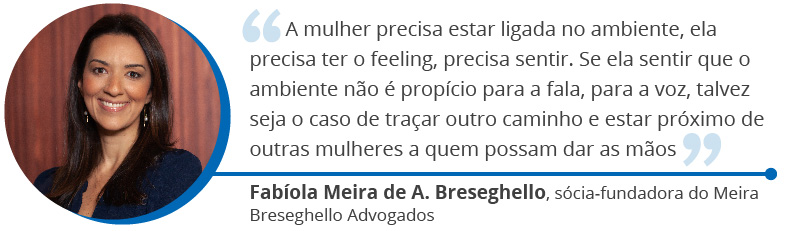No campo profissional, Fabíola Breseghello ressaltou a importância da capacidade técnica como fator fundamental para uma ascensão. Contudo, ela recorreu a outra passagem de sua carreira para defender que a mulher precisa estar ligada ao ambiente para enxergar uma oportunidade de crescimento. Fabíola trabalhou em um escritório de advocacia com pai e dois filhos à frente, onde o ambiente masculino era muito presente e restrito a oportunidades para mulheres.