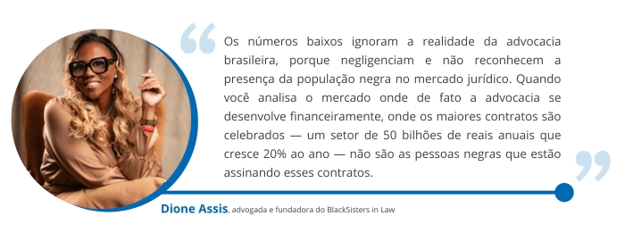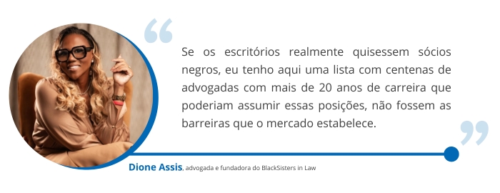 "Sempre me chama atenção aqui na Black Sisters in Law quando colegas de grandes escritórios me contam que não participam de casos emblemáticos sem justificativa. Elas tinham capacidade e preparo, mas não foram incluídas. Como essa pessoa vai adquirir experiência, visibilidade e projeção se não é incluída? Que tipo de seleção é essa que admite, mas não inclui? Se ingressou como estagiária, é obrigação do escritório prepará-la para assumir grandes casos, e não mantê-la apenas nos de menor repercussão. Isso inviabiliza sua visibilidade dentro e fora do escritório", questiona Dione Assis.