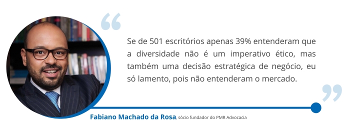 Fabiano Machado da Rosa defende uma mudança de mentalidade na alta gestão. "Me parece que é fundamental que a alta governança dos escritórios — os comitês executivos, CEOs e conselhos de administração — tratem o tema da diversidade, da equidade, da inclusão como uma grande oportunidade ética e de negócio do ponto de vista de estratégia organizacional. Esse assunto tem que sair do âmbito da responsabilidade social, do ESG, e tem que entrar no âmbito da resiliência do negócio, da estratégia de posicionamento e no âmbito de como queremos que nosso escritório seja e o que ele represente no futuro. E me parece que só vamos mudar esses indicadores com decisões intencionais."