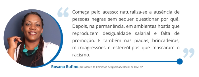 Rosana Rufino identifica no imaginário social uma das barreiras mais persistentes. "O imaginário social sobre quem 'pode' ocupar cargos de poder ainda segue um padrão eurocêntrico: homem branco, hétero, cis, cristão. Esse ainda é o perfil da maioria dos sócios de grandes bancas. Mulheres, pessoas negras e outros grupos atravessados por diferentes marcadores sociais quase não ocupam esses espaços. E isso está ligado ao passado escravocrata e colonial do país, que ainda impede que pessoas negras sejam vistas como capazes de ocupar espaços de poder".