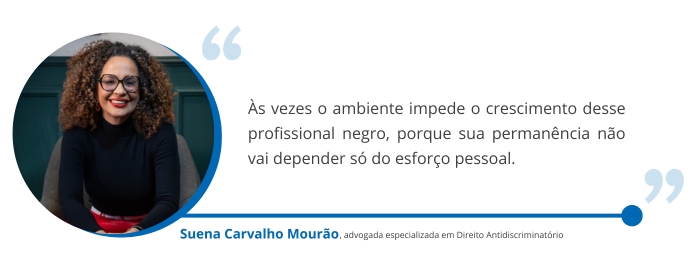 Suena Mourão destaca o peso emocional dessa experiência. "Quando o profissional negro está dentro de um ambiente de escritório de advocacia, a sobrecarga emocional e cognitiva — por ter que estar sempre provando a sua competência — é muito pesada. Então, obviamente o profissional negro vai querer ascender. Nós todos queremos isso e temos direito de ascender com os demais. Porém, o fato de ter que estar sempre em alerta, aliado a fadiga do ambiente, às vezes veladamente hostil ou excludente, faz com que a permanência dele não dependa só da sua potência."