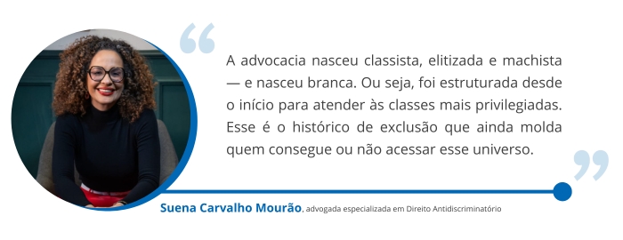 O caminho até a sociedade em um grande escritório começa, na verdade, muito antes da primeira entrevista de emprego. Começa na universidade — ou melhor, na impossibilidade de acessá-la em condições de equidade. "O Direito ainda é um curso muito elitizado, de difícil acesso e de difícil manutenção do estudante no curso, por conta dos custos dos livros, por exemplo. E depois, o próprio exame da OAB também possui um custo elevado", descreve Suena Mourão.
