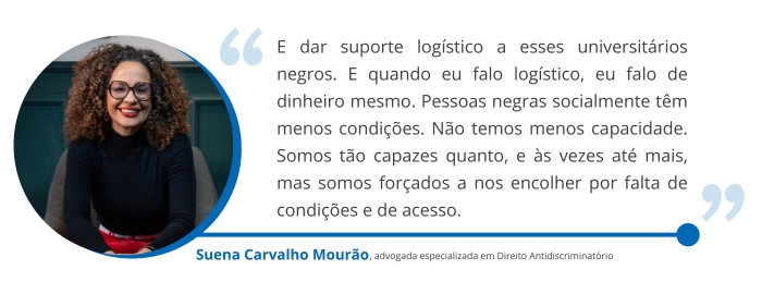 Suena Mourão é enfática sobre a diferença entre discurso e prática. "Eu acho que hoje em dia, como a implementação de ESG, ficou muito evidente que ninguém quer ser racista. A verdade é essa, ninguém quer receber a pecha de racista. Só que muitas vezes a gente não vê na prática. O discurso é muito bonito, as políticas são muito bonitas, a apresentação, o lançamento das políticas, mas na prática, não temos conseguido obter resultado com isso. Porque às vezes a política é muito bem feita na teoria, mas é implementada numa cota mínima."