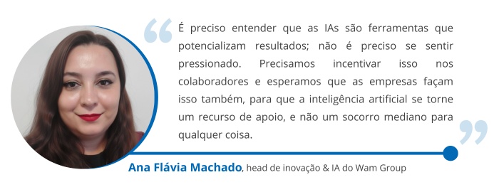 A pressão pela entrega de resultados também é um fator determinante que pode levar ao uso de IA extraoficial. Ana Flávia Machado, head de Inovação & IA do Wam Group, acredita que esse é um movimento natural em empresas que fazem esse tipo de cobrança aos colaboradores. "Se você quer buscar mais resultados, não existe hoje no mercado fazer trabalhos manuais sem o apoio de uma IA. Seja para escrever um texto ou buscar conhecimento, isso está disseminado para todo mundo."