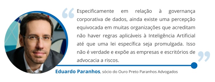 Ele aponta que existe uma legislação geral para outros assuntos em vigor no Brasil que também pode se aplicar à IA, como, por exemplo, a LGPD, Código de Defesa do Consumidor, Marco Civil da Internet, Código Civil ou Código Penal. Além disso, ele também destaca que o uso indevido de informações confidenciais é um crime, previsto na Lei 9.279, artigo 195. "Todas essas legislações também se aplicam à IA. Então, é importante ter um foco e um olhar bem cuidadoso para a governança do uso da IA nas organizações", conclui Paranhos.